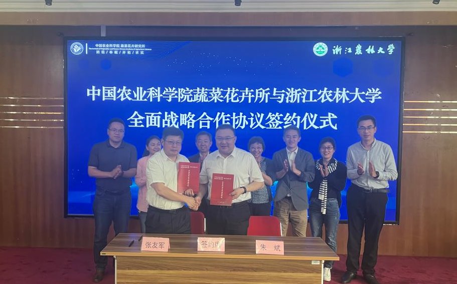 5月20日,我校與中國農(nóng)科院蔬菜花卉所戰(zhàn)略合作協(xié)議簽訂儀式在北京舉行。中國農(nóng)科院蔬菜花卉所所長張友軍、副所長翟研寧,我校黨委書記朱斌、副校長吳家勝出席簽約儀式。