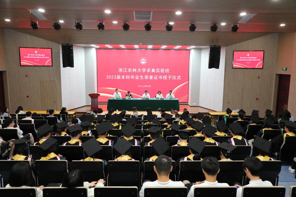 6月16日下午,浙江農林大學求真實驗班2023屆本科畢業生榮譽證書授予儀式在學三國際報告廳舉行。校長沈希教授、副校長沈月琴教授出席儀式。