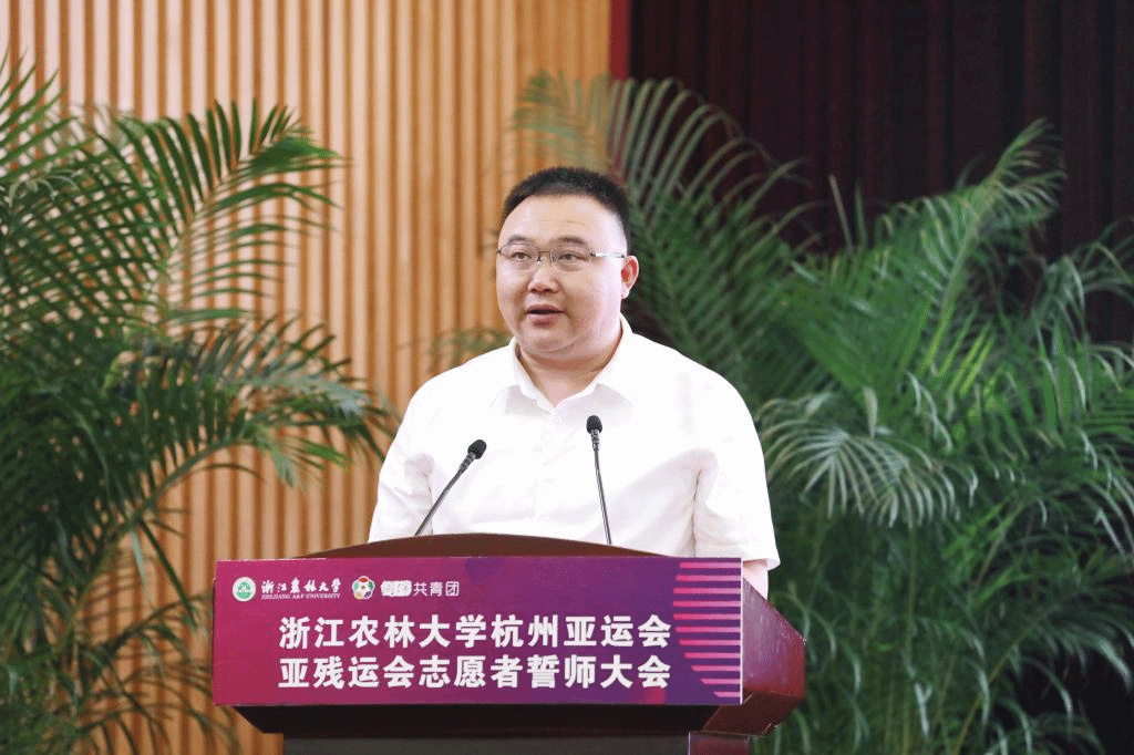 朱斌對我校826名亞運會志愿者及志愿者領隊教師表示敬意,向一直以來關心支持我校亞運志愿服務工作的臨安團隊以及廣大師生表示衷心的感謝。朱斌指出,杭州亞運會是黨的二十大勝利召開后舉辦的一場國際綜合性體育文化盛會,高質量服務杭州亞運,有力彰顯護航亞運的高校擔當,浙江農林大學責無旁貸、浙江農林大學志愿者們使命光榮。
