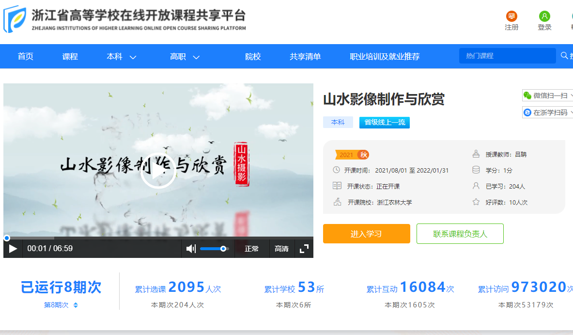 為提高全校學生人文素養和藝術審美能力,藝術設計學院以實際行動踐行《浙江農林大學關于深化“美育”工作的行動方案》。平均每年開設54門美育課程,選課學生達到3000多人次,建成了包括《書法鑒賞》《影視鑒賞》《實用鋼琴藝術》《手機攝影》等在內的在線開放課程,并在慕課以及校超星平臺上推出。這些課程吸引了2萬多學生訪問,其中《手機攝影》和《山水影像制作》等優質通識課程被認定為浙江省一流課程。
