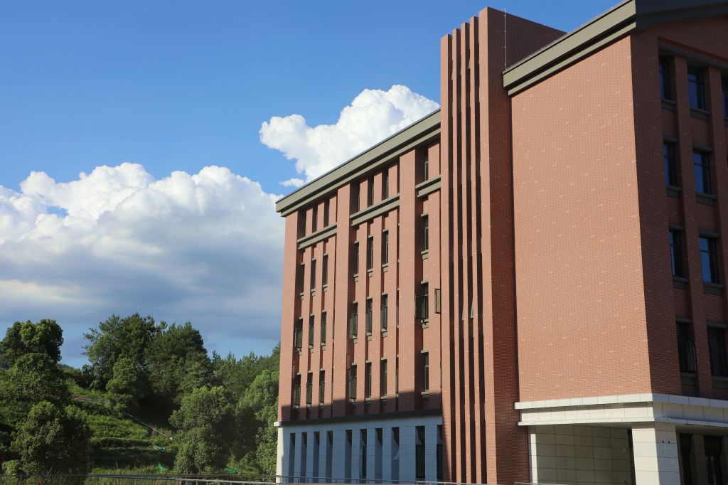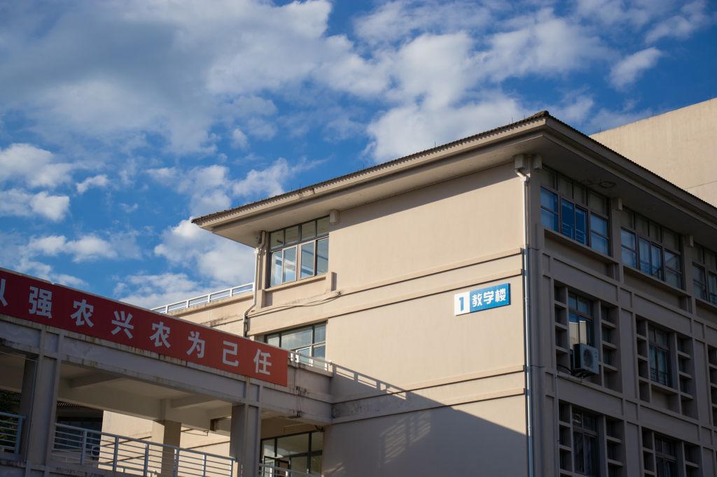 紅墻褐頂的新農科大樓在藍天白云的映襯下,
