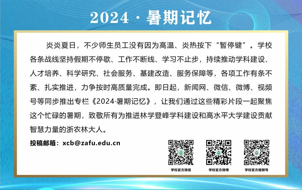 時無重至,華不再陽。浙農林大學子們都在抓住寶貴的暑期,珍惜每分每秒,為了自身科研創新目標與時間賽跑。他們在炎炎夏日的蟬聲中,為青春的篇章添上一抹生機勃勃的綠意,寫下充滿希望的伏筆。
