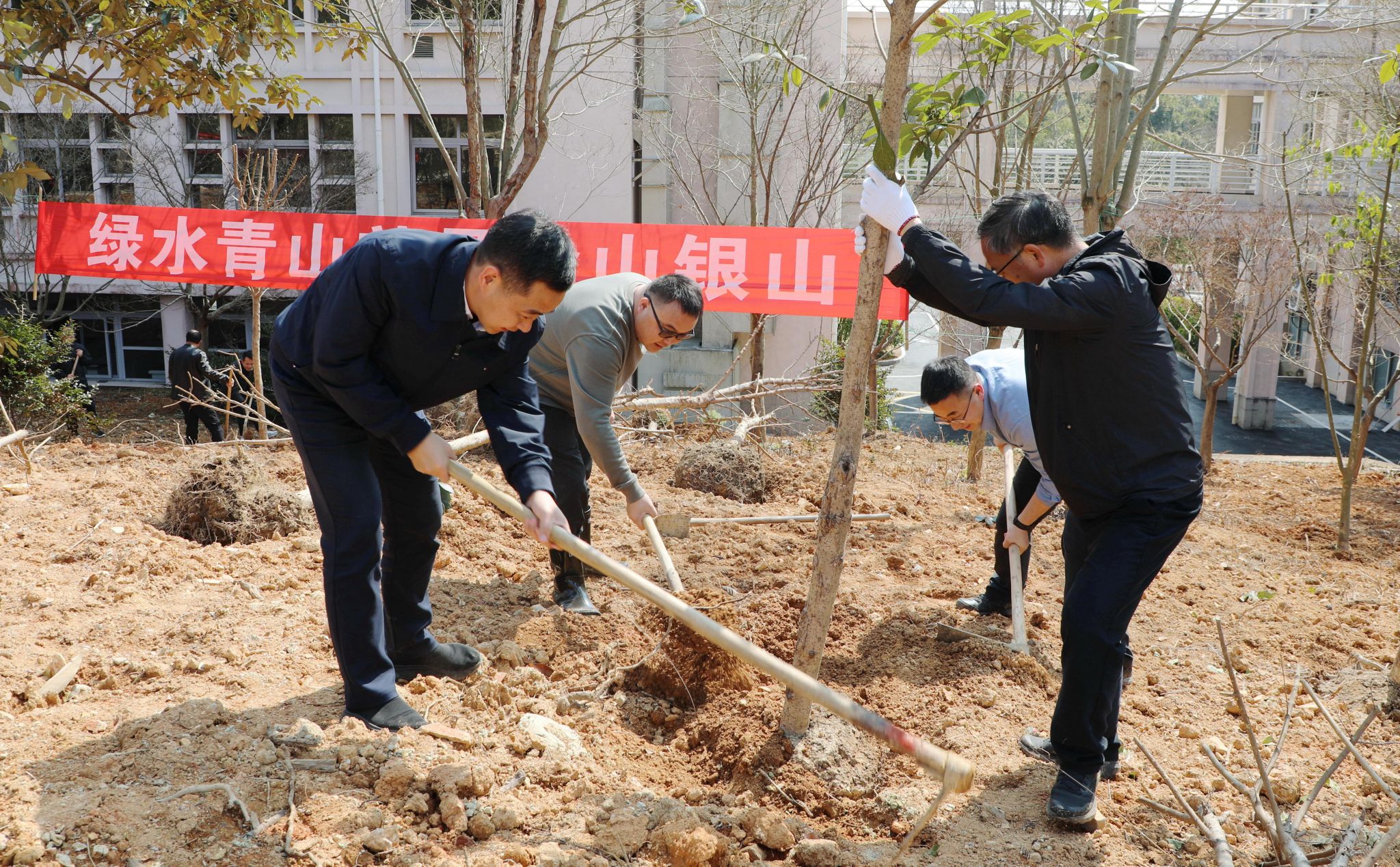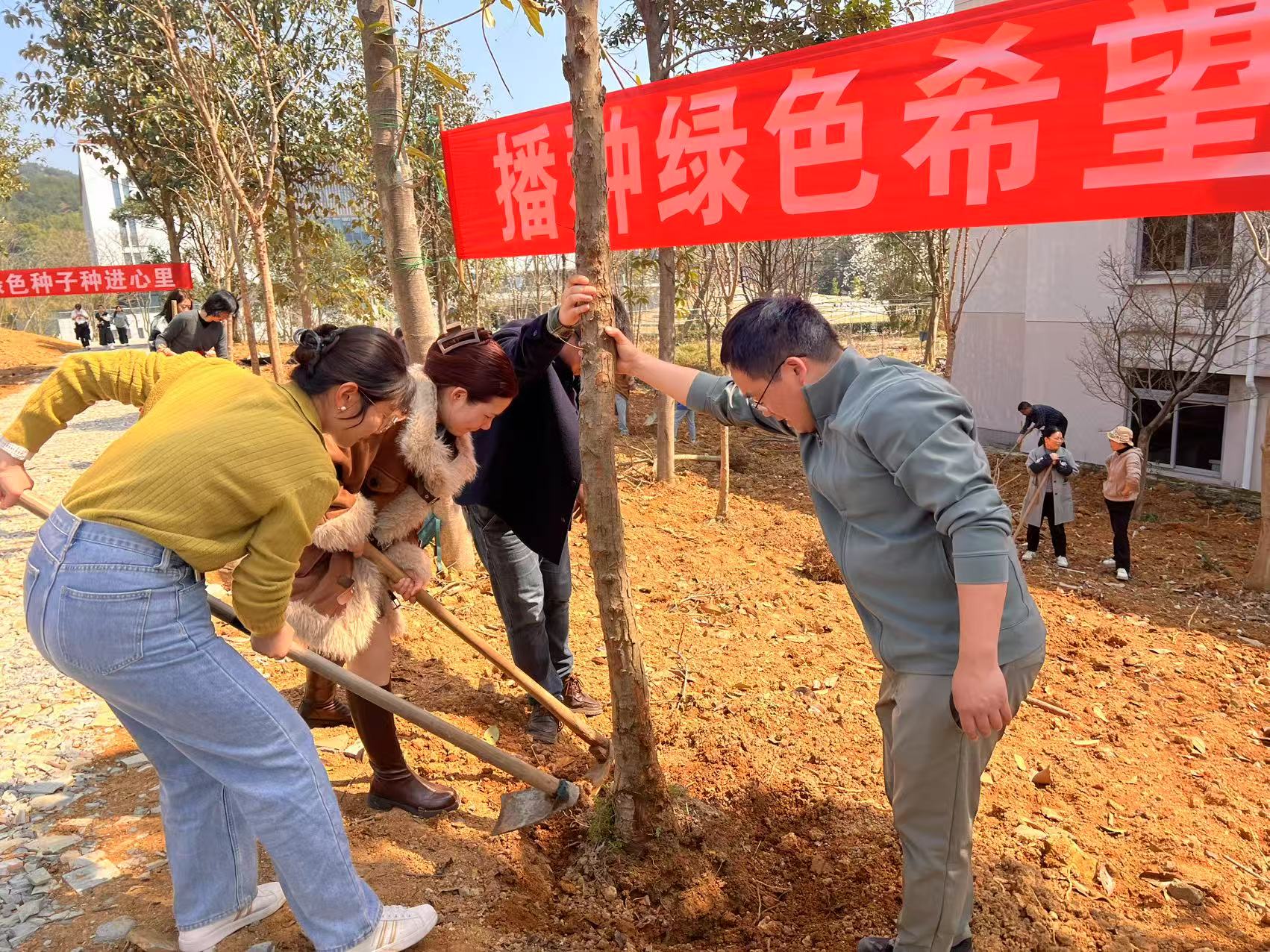 師生們手持鋤頭、鐵鍬等工具,鏟土、拍土、植入、扶苗、覆土定植……大家分工合作、密切配合,每個(gè)步驟都有條不紊,整個(gè)勞動(dòng)場面繁忙而有序。不到2小時(shí),柿樹、三角楓、紅豆樹、紅豆杉、細(xì)柄阿丁楓、浙江楠等近50株承載著希望的樹苗迎著春風(fēng)而立,煥發(fā)出勃勃生機(jī),為大地增添了新綠。