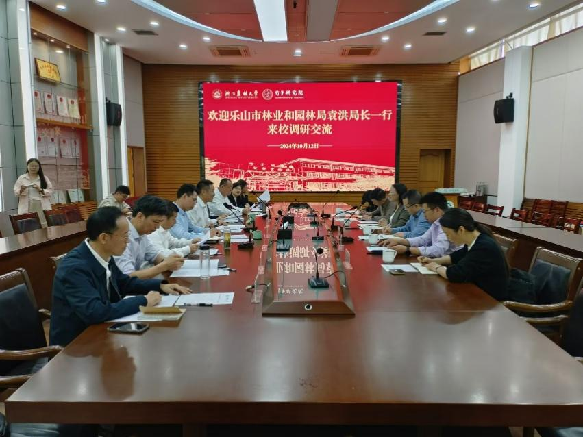 10月12日,樂山市林業和園林局局長袁洪一行來校調研交流,副校長徐愛俊,校原黨委副書記、竹子研究院名譽院長方偉陪同調研并座談。