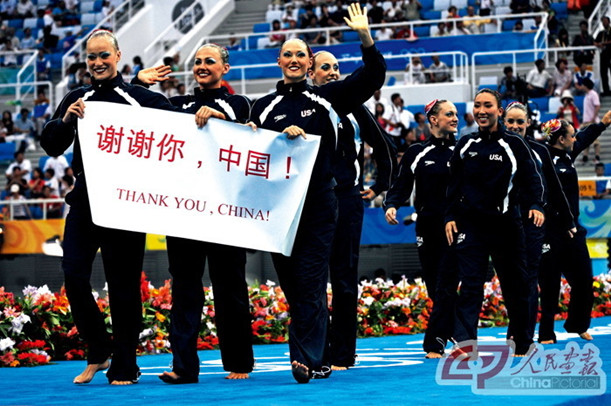 2008年8月23日,北京奧運會花樣游泳集體項目自由自選決賽在國家游泳中心——“水立方”舉行。美國隊隊員入場時,打出“謝謝你,中國”的條幅。2008年8月8日至24日,第29屆夏季奧林匹克運動會在北京成功舉辦。來自204個國家和地區的1萬余名運動員在16天里挑戰極限、攀越新高,刷新了38項世界紀錄和85項奧運會紀錄,多個國家和地區實現了奧運會金牌和獎牌零的突破,奏響了更快、更高、更強的激情樂章,描繪了團結、友誼、和平的壯麗畫卷。國際奧委會主席羅格在閉幕式上評價北京奧運會是一屆“真正的無與倫比的”奧運會。