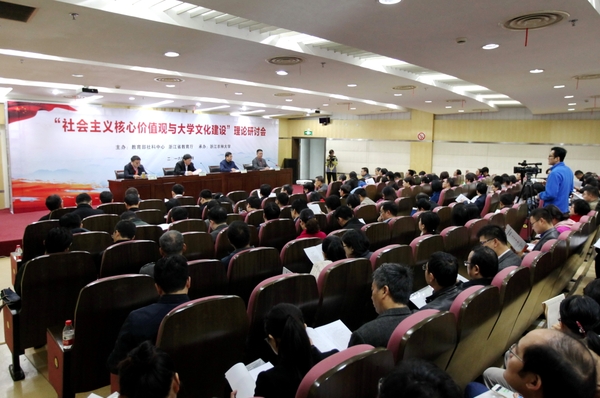 11月12日,由教育部高等學校社會科學發展研究中心、浙江省教育廳主辦,我校承辦的“社會主義核心價值觀與大學文化建設”理論研討會在東湖校區舉行。本次會議的主題為“發揮大學文化育人功能,推動社會主義核心價值觀落細落小落實”。來自全國各地高校從事社會主義核心價值觀與大學文化建設宣傳、教育、研究的專家學者共計一百余人參加會議。