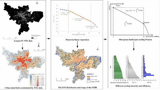 城市熱島是全球關注的焦點,該文基于Luojia1-01夜光數據提出了同心圈模型描述城市的空間結構,運用該模型沿城鄉梯度構建若干個等面積同心帶(URBs),探究城市熱島的空間形態及相應的藍綠景觀降溫效果。為了解城市熱島的空間格局和優化城市功能區空間規劃提供了科學依據和技術支撐。研究表明,由于藍綠景觀密度不同,不同城鄉帶(URBs)的降溫能力存在顯著的空間異質性,URB16的降溫能力約為URB1的71倍。藍綠景觀密度越大,冷卻效率越高。因此,在城市功能區的規劃中,藍綠景觀密度的推薦閾值分別為40%和70%。