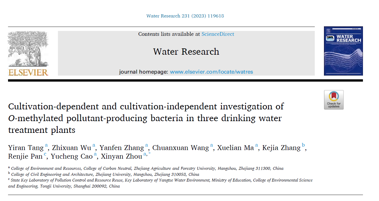 近日,環境與資源學院、碳中和學院曹玉成教授團隊(土水污染控制團隊)在《Water Research》(中科院1區,IF=13.400)發表題為“Cultivation-dependent and cultivation-independent investigation of o-methylated pollutant-producing bacteria in three drinking water treatment plants”的研究論文。該論文第一作者為環境與科學工程2019級本科生湯薏然,通訊作者為青年教師周昕彥。浙江農林大學環境與資源學院、碳中和學院為該論文第一單位和通訊作者單位。